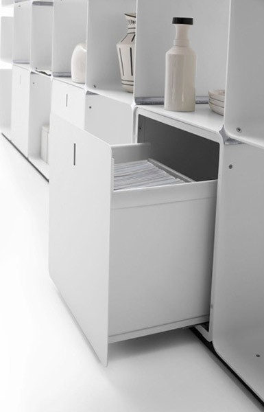 Modulares Bücherregal auf Aluminium mit lackiertem Metall Schubladen. Kugelfuehrungen fuer Schubladen, tragkraft Faecher 15 Kg, verstellbare Fuesse und Wandhalterung.