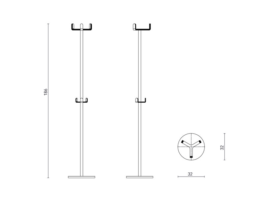 Dieser Garderobenständer hat drehbare Kleiderbügel auf der oberen und mittleren Ebene. Rahmen aus Stahlrohr und Metall in Standard-RAL (schwarz oder weiß) oder Selected RAL. Struktur pulverbeschichtetes Basisteil und Oberteil aus Chrom.