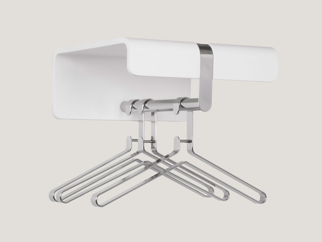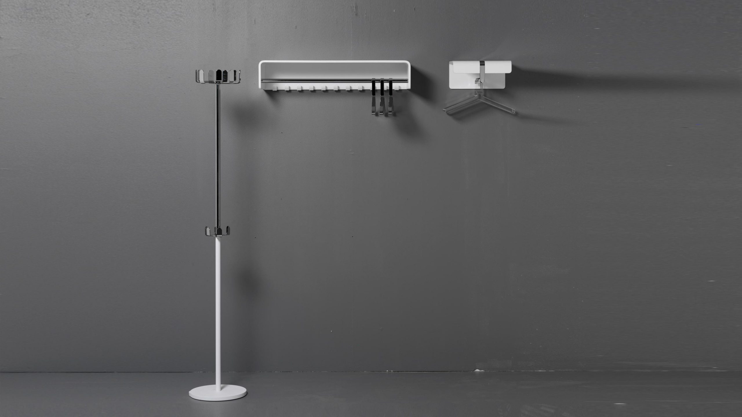 Wandgarderobe in 2 Ausführungen, 35 oder 90 cm Breite. Rückenteil aus gebogenem Blech in Standard-RAL (schwarz, weiß oder silber), Selected RAL oder Anycolour RAL. Holzteile in Birke, Eiche oder Beize. Mit festen oder beweglichen Kleiderbügeln..