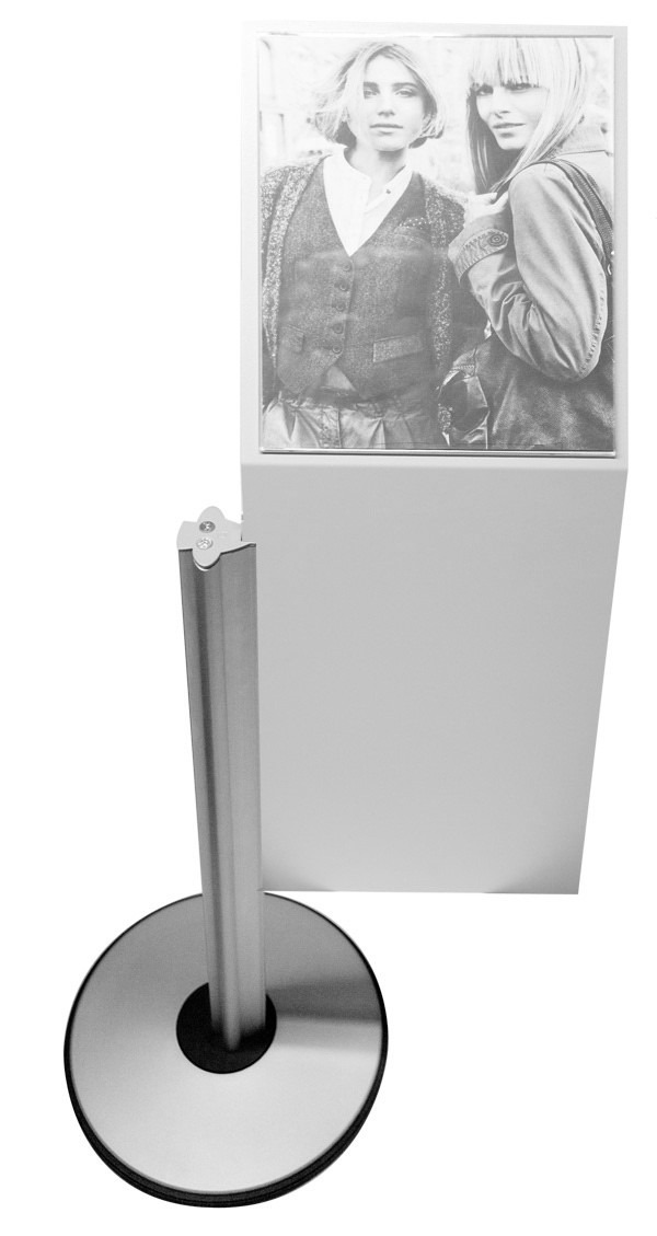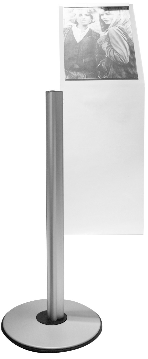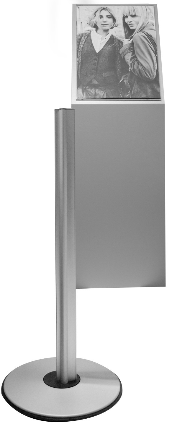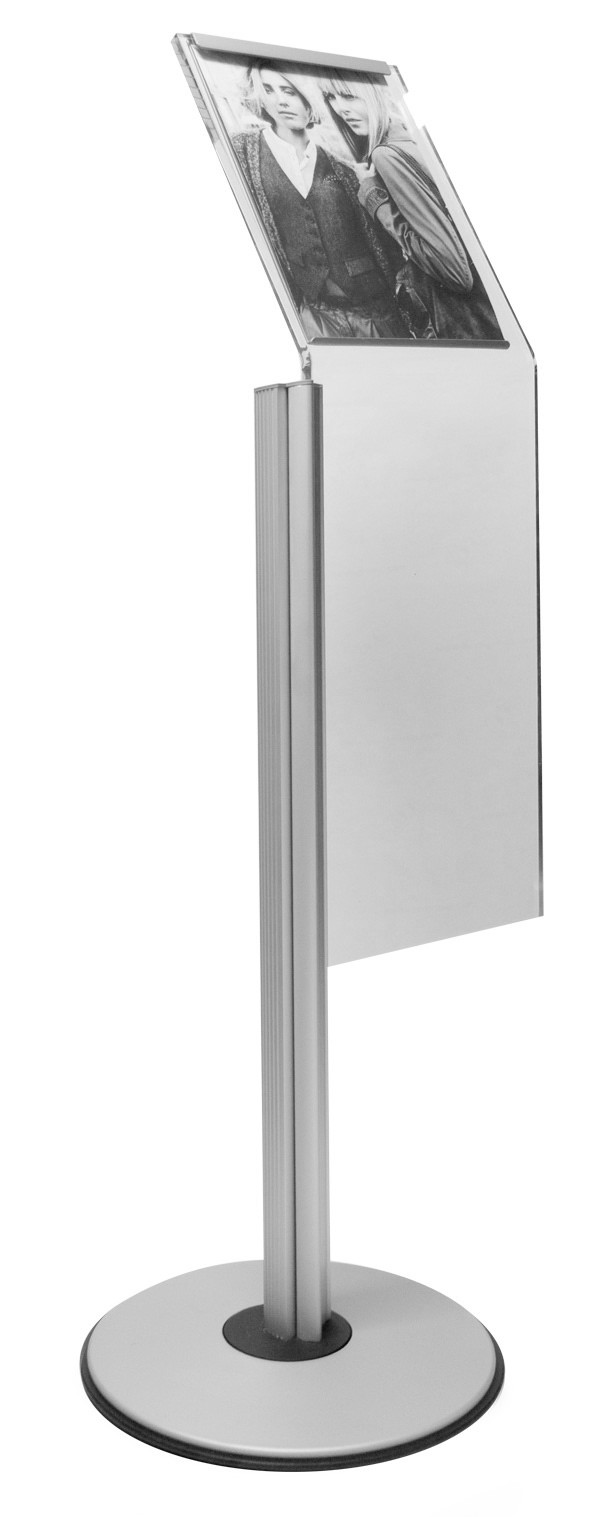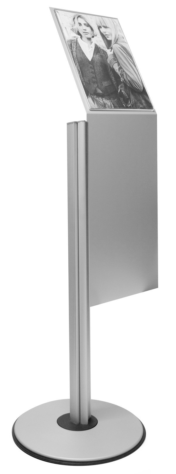Die stranggepressten, Silber eloxierten Aluminiumprofile sind das Hauptmaterial, aus denen dieser Bodenständer besteht. Eine Grundplatte aus Eisenguss sorgt für einen sicheren Stand. Als Informationsträger kann eine 10mm klare Acrylglasscheibe oder ein pulverbeschichtetes (RAL 9006) 1.5mm Metallblech ausgewählt werden. Bei der klaren Acrylglasscheibe wird das DINA4 Blatt rückseitig in einen Stahlblechträger eingesetzt. Die silberne Sockelabdeckung kann jederzeit entfernt werden.