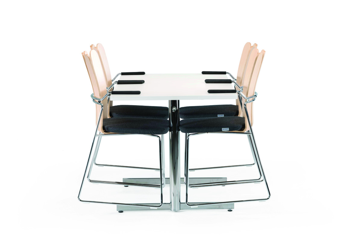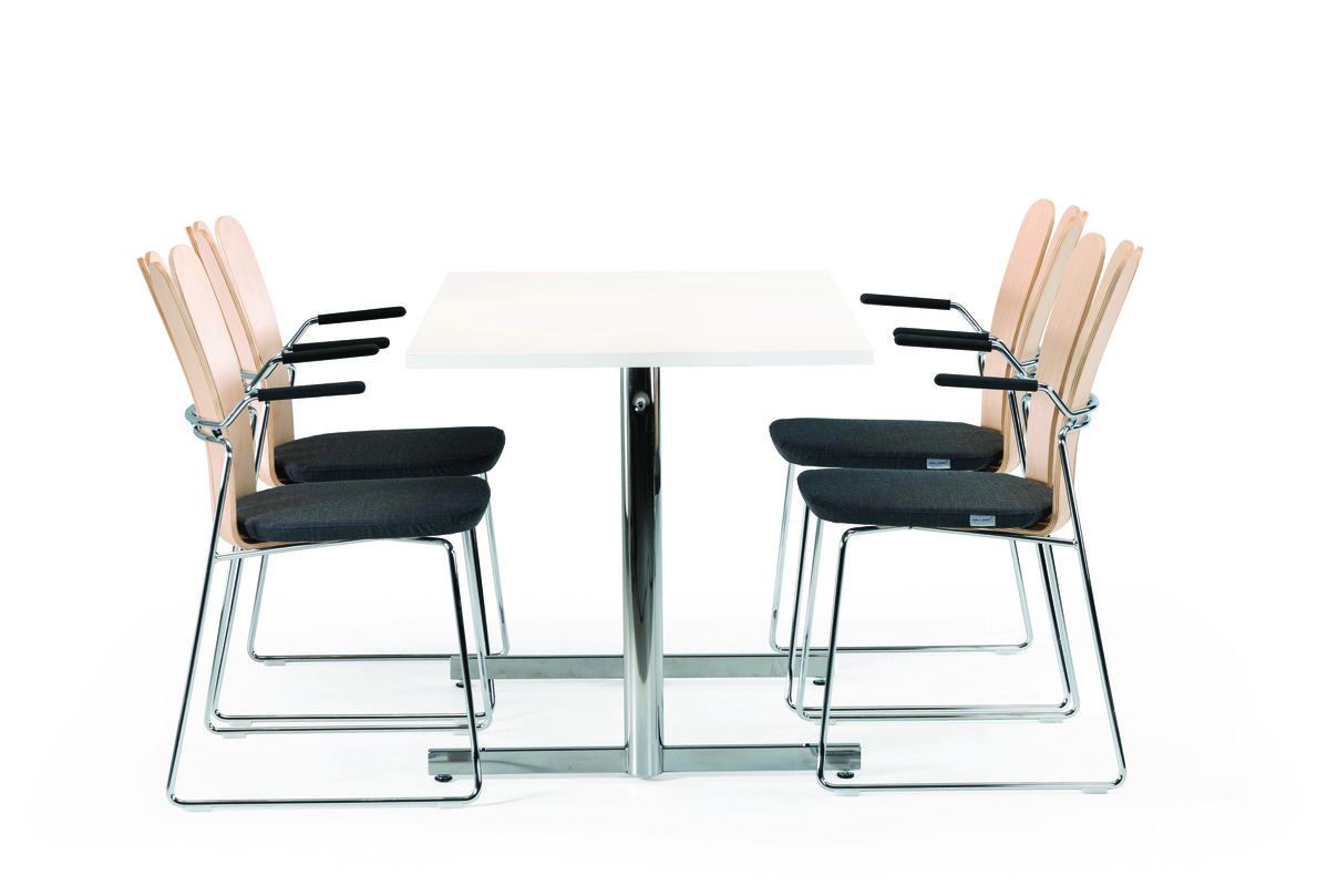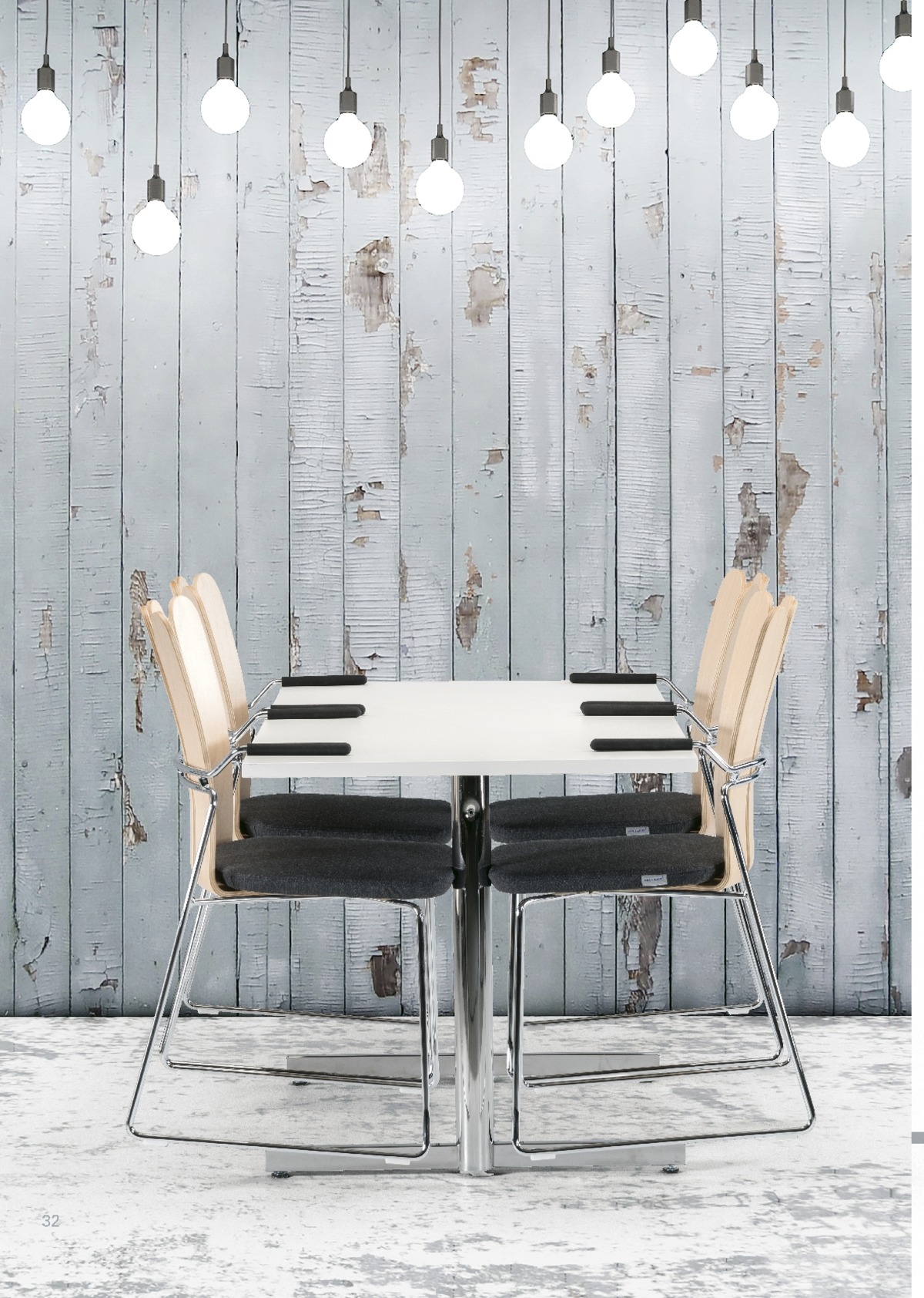 DIS Stapelstuhl kommt mit Sitz gepolstert. Rück in Birke oder Eiche natur oder lackiert. Stahl in Chrom oder grau Lack.