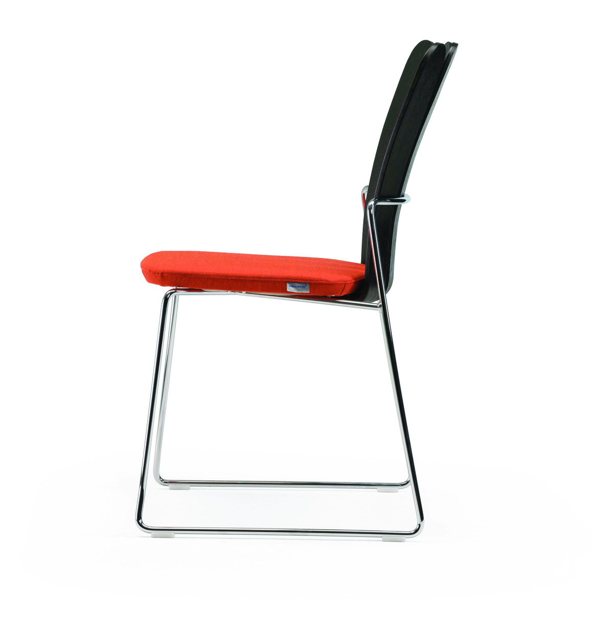 DIS Stapelstuhl kommt mit Sitz gepolstert. Rück in Birke oder Eiche natur oder lackiert. Erhältlich mit Armlehnen. Stahl in Chrom oder grau Lack.