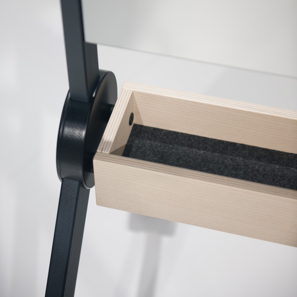 Arbeit wird heutzutage zunehmend flexibler. Feste Arbeits- und Konferenzräume sind nicht mehr selbstverständlich. Die beidseitige, mobile Schreibtafel hat einen anthrazitgrauen Stahlrahmen mit Rollen. Unterhalb der Schreiboberfläche befindet sich ein Holzfach beispielsweise zur Aufbewahrung von Stiften und Tafelwischern. Das Holzfach verleiht dem Produkt Wärme.