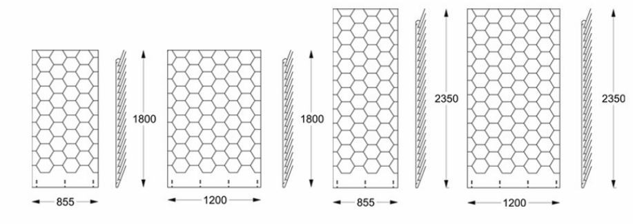 Die Breite eines Standardmoduls beträgt 855 oder 1200 mm und die Höhen 1800 oder 2350 mm.