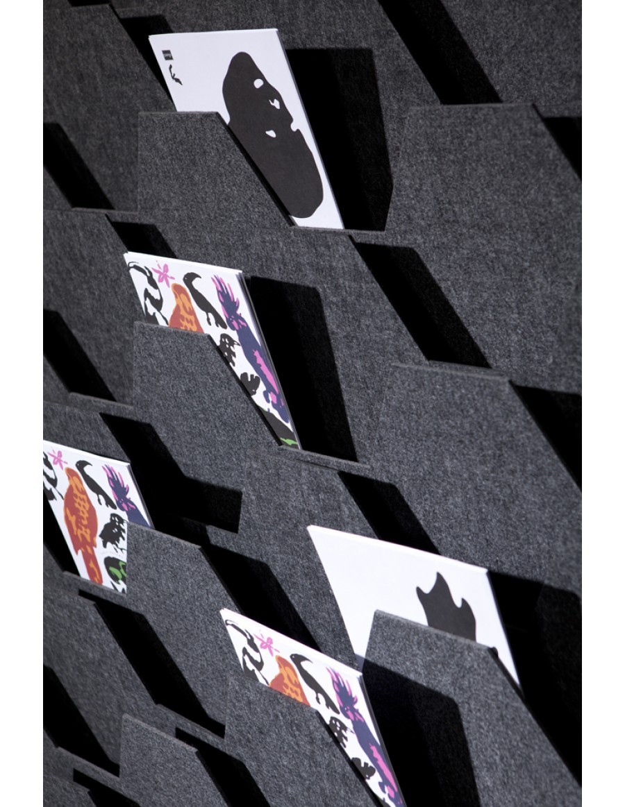 Feltart ist ein kunstvoller Zeitschriftenpräsenter,  ein Stauraum und eine schöne akustische Wand. Feltart ist aus 100% recyclingfähigem Polyesterfilz hergestellt. Das Design sorgt für minimale Verschwendung von Filz- und Metallteilen.