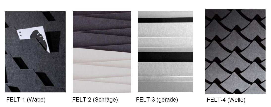 Vier verschiedene Muster: FELT-1 (Wabe), FELT-2 (Schräge), FELT-3 (gerade) und FELT-4 (Welle).