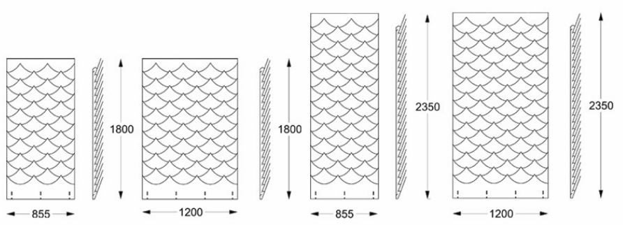 Die Breite eines Standardmoduls beträgt 855 oder 1200 mm und die Höhen 1800 oder 2350 mm.
