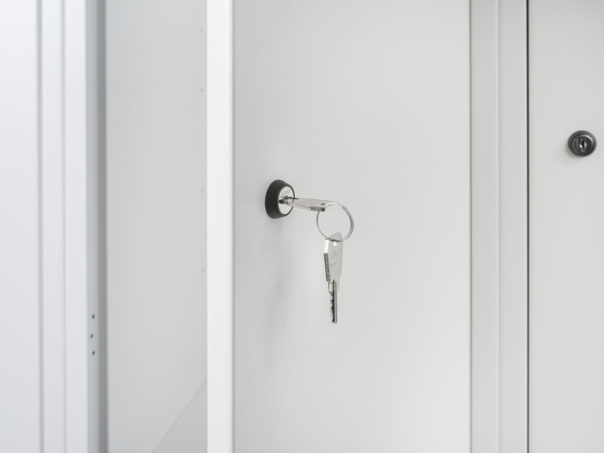 Die Schränke sind serienmäßig mit einem Zylinderschloss ausgestattet. Tipp: Bestellen Sie einen Hauptschlüssel dazu, damit Sie die Schränke im Notfall jederzeit leicht öffnen können.