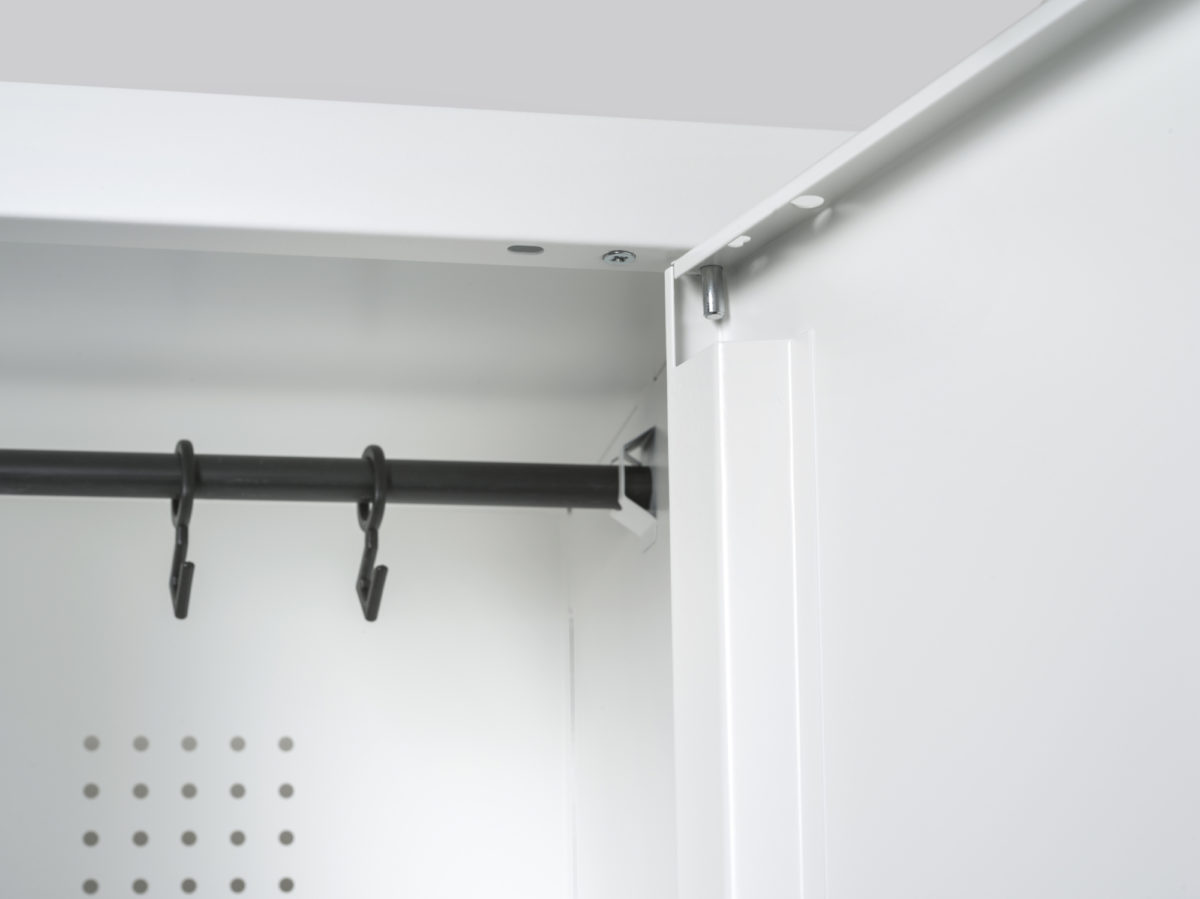 Ein Garderobenschrank ist nicht komplett ohne eine Kleiderstange mit Haken, einem Spiegel und Belüftungsöffnungen in der Rückwand zur optimalen Durchlüftung.