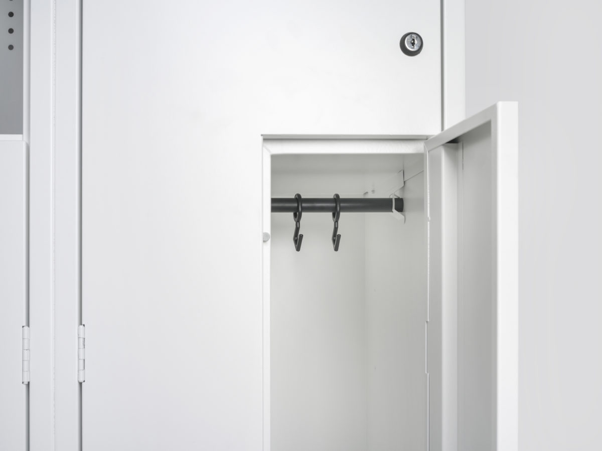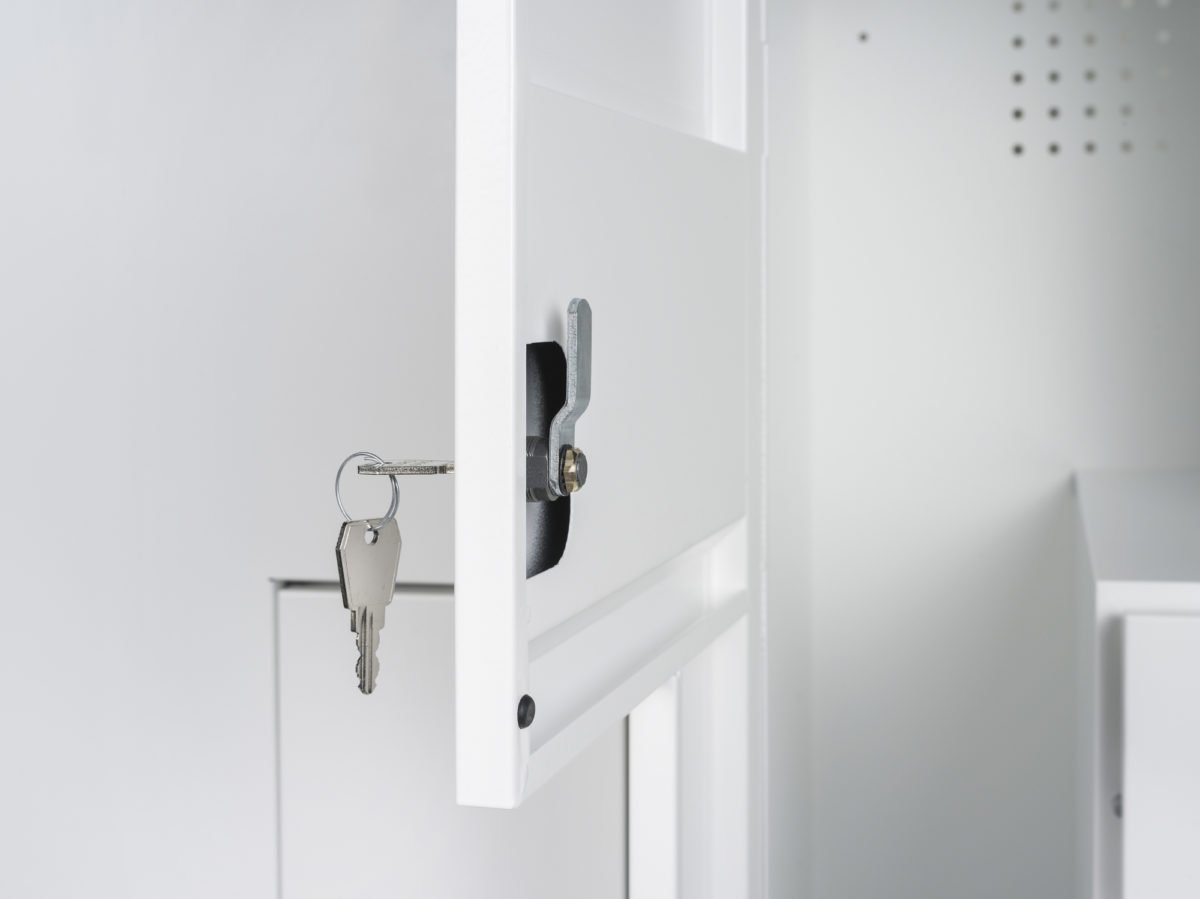 Die Schränke sind serienmäßig mit einem Zylinderschloss ausgestattet. Tipp: Bestellen Sie einen Hauptschlüssel dazu, damit Sie die Schränke im Notfall jederzeit leicht öffnen können.