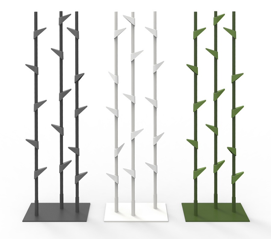 Die bunten Ausführungen des Bamboos aus Stahl. Spielen Sie mit den Farben und Ausführungen, um die optimale Garderobe für Ihr Projekt zu entwerfen. Indem Sie den Haken nach oben schieben, den Gummi O-Ring nach Wunsch versetzen und den Haken wieder in seine Position zurück klicken, können die fünf Haken an jedem Ständer leicht verstellt werden.