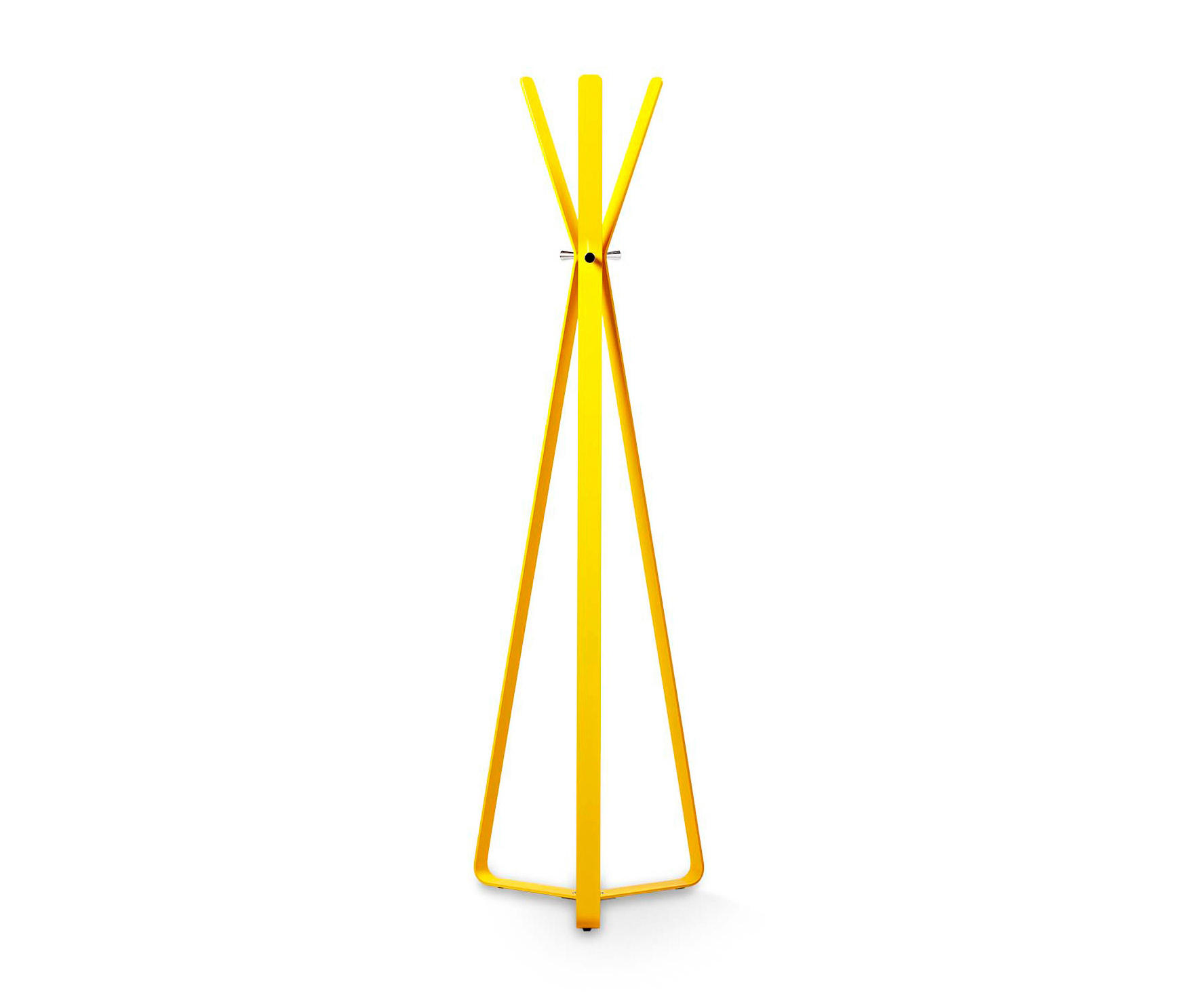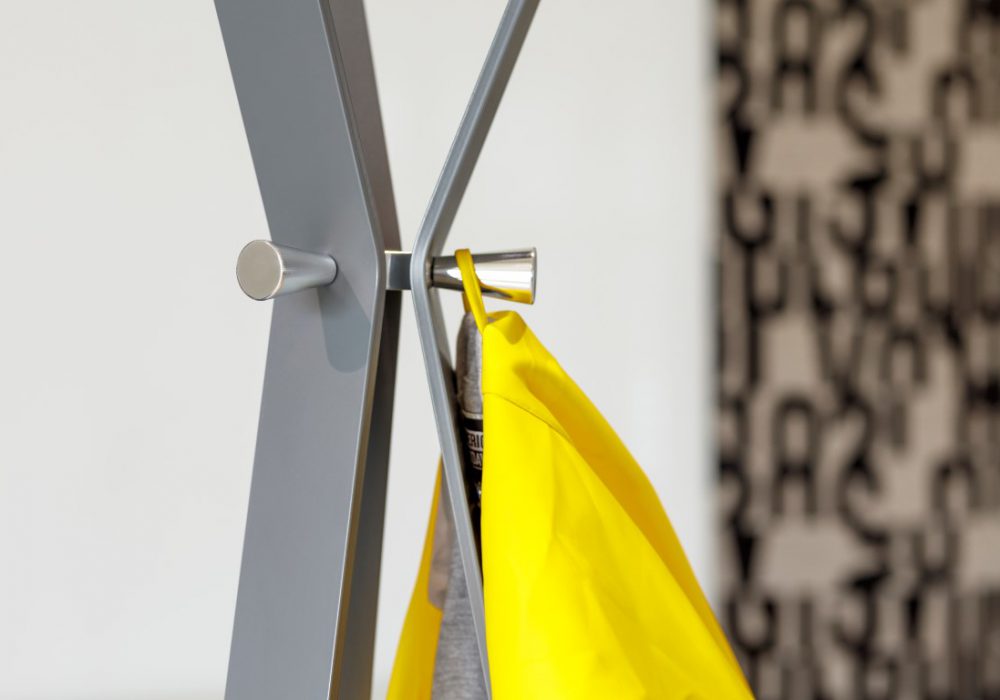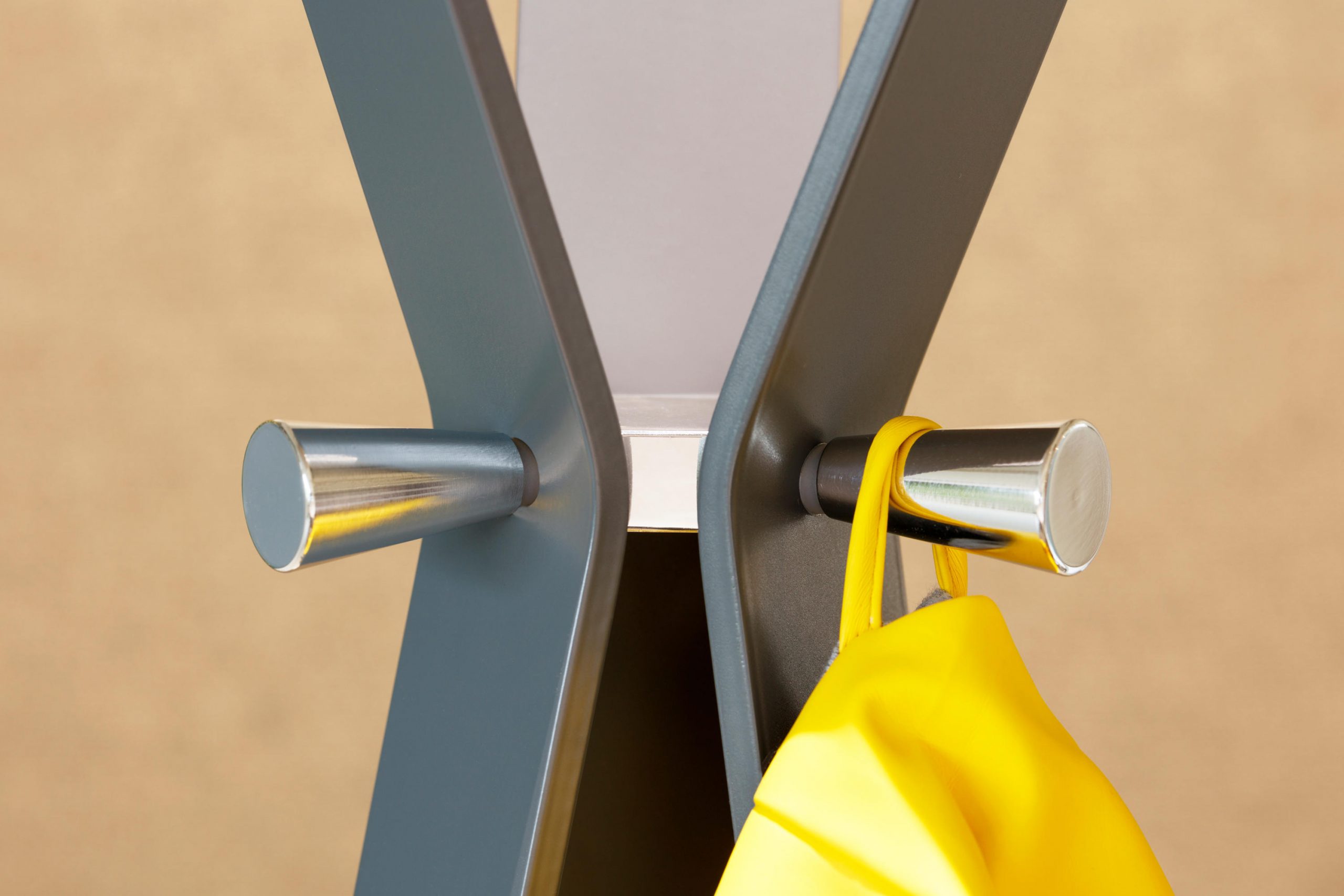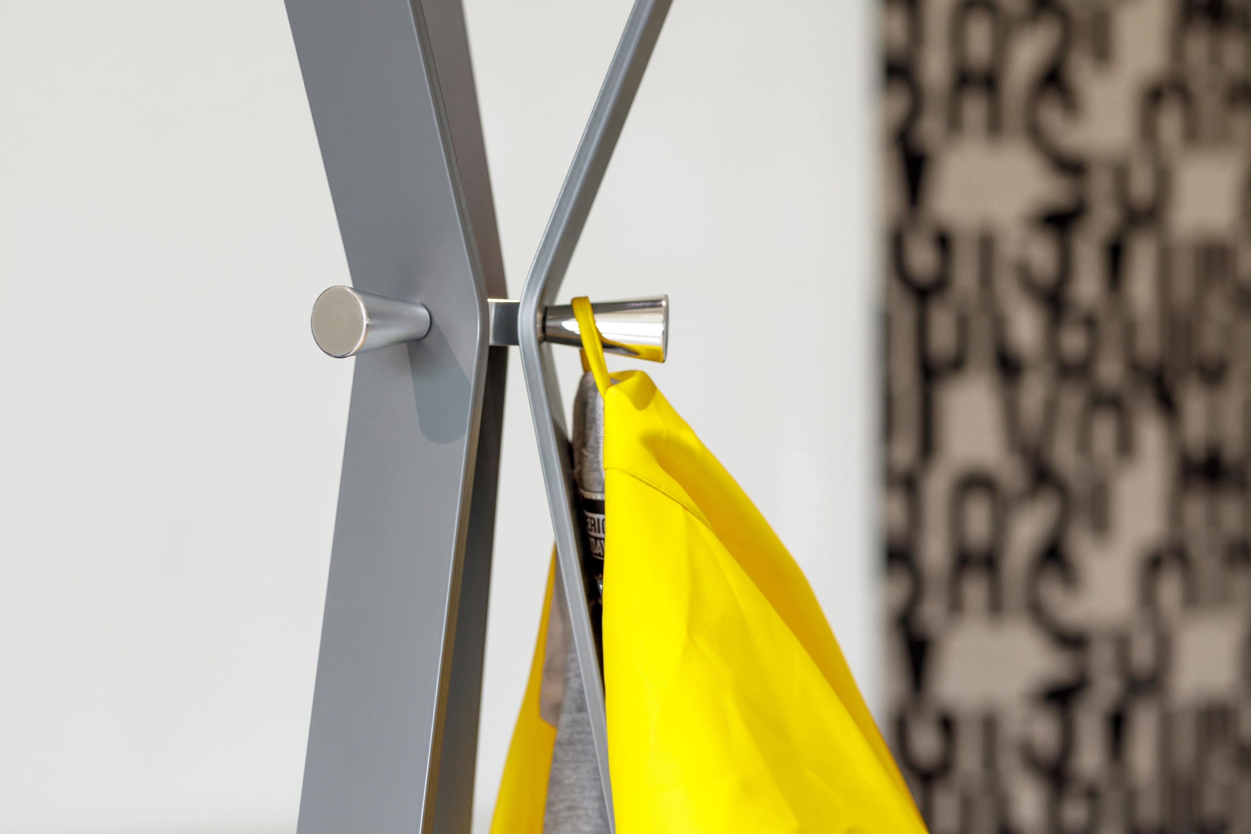 Bend besteht aus gebogenen Metallständern, die auf attraktive Art zusammentreffen. Die Jacken werden über das sorgfältig abgerundete Ende des Streifens gehängt oder an die polierten Aluminiumknöpfe, mit denen die Ständer verbunden sind. Ein subtiles Verbindungsdetail auf dem Boden bringt auch hier die Ständer harmonisch zusammen. Bend ist in frischem Weiß, fröhlichem Gelb und solidem Grau erhältlich.