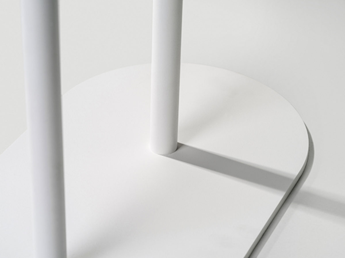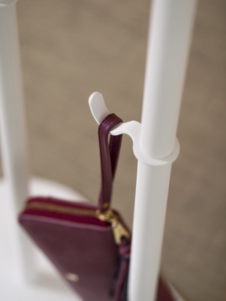 Durch die gefrästen Rillen im Eschenholz wahren die Tubulus 100 Kleiderbügel Distanz zueinander. Zweckmäßig und elegant: am subtilen, höhenverstellbaren Haken kann man seinen Schlüsselbund, einen kleinen Schirm oder die Handtasche aufhängen. Philippe hat eine solide Basis. Die charakteristische, schwere Bodenplatte sorgt für Stabilität.