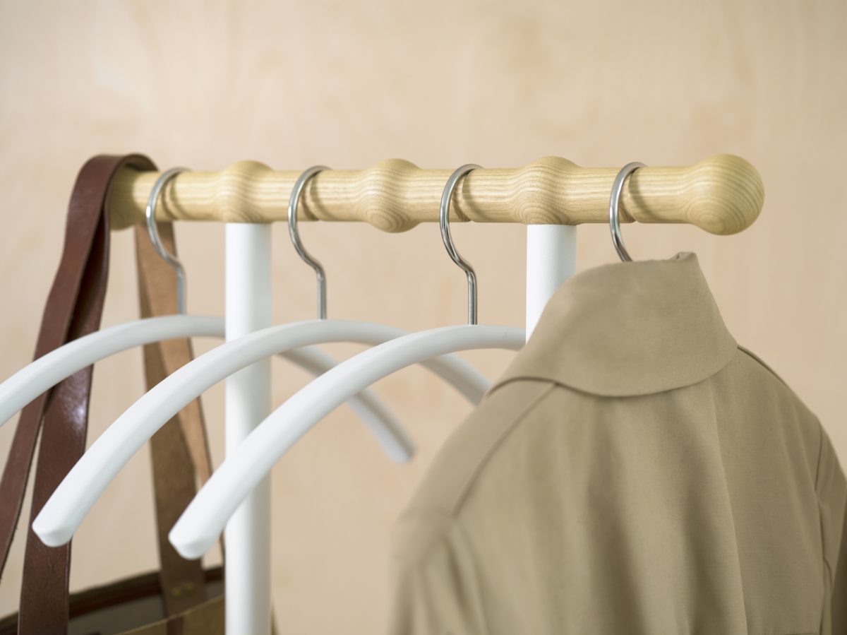 Garderobenständer Philippe- In Augenhöhe fällt besonders ein formschön gestaltetes Teil aus Eschenholz auf.