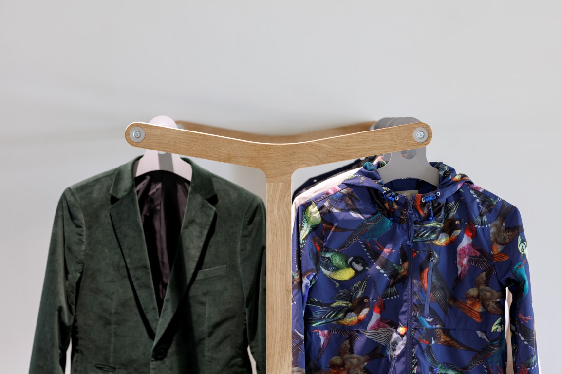 Dieser Garderobenständer bietet doppelte Aufhängekapazität. Garderobenständer ist in verschiedenen Breiten lieferbar und kann verkettet werden. Die Elemente sind in Eiche Natur, in Schwarz und Weiß lieferbar und können mit Garderobenhaken oder Kleiderbügeln bestückt werden