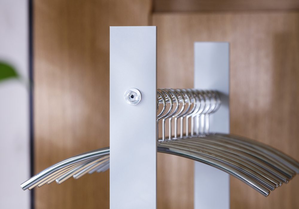 Es ist eine Garderobe, die jeden Empfangsbereich zu etwas Besonderem macht. Unsichtbare Schwenkrollen machen ein Umstellen einfach. Die Garderobenstange kann mit 12 Rillen oder glatt ausgeführt werdenn. Bei der Rillen-Version hängen die Jacken ordentlich in einer Reihe. Bei der glatten Stange können mehr als zwölf Bügeln verwendet werden.