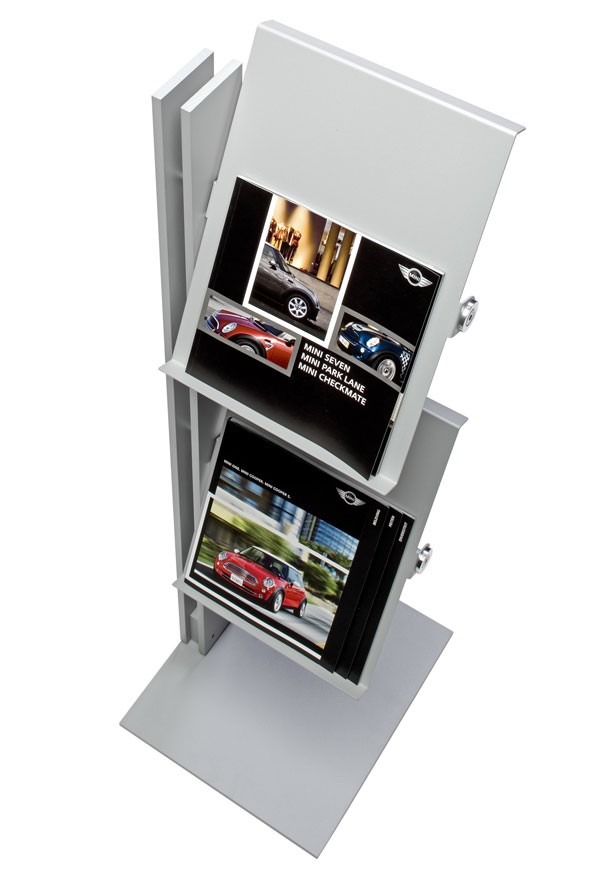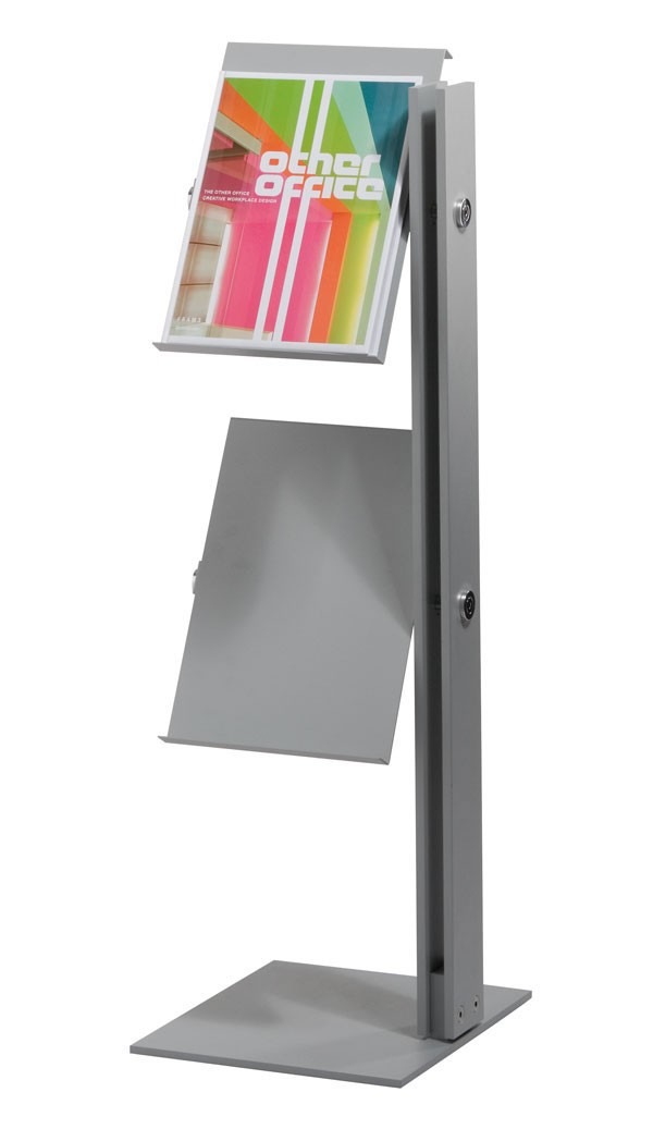Nutzen Sie den Prospektständer mit einem oder zwei multifunktionalen Tableaus für Ihre Werbung.