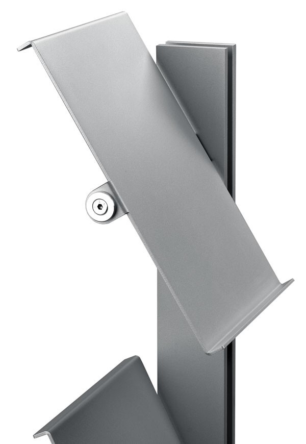 Nutzen Sie den Prospektständer mit einem oder zwei multifunktionalen Tableaus für Ihre Werbung. Die flexible Winkeleinstellung erlaubt fünf verschiedene Tableau-Positionen (inklusive einer horizontalen Position beispielsweise für Prospektvorrat). Die Tableaus und Ständer sind hochwertig in Aluminium RAL 9006 gefertigt. Die Verbindungen bestehen aus poliertem Aluminium.