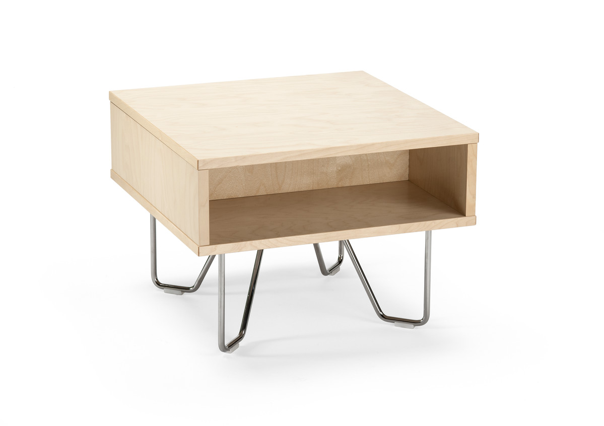 Der Kits Tisch ist in Birken- oder Eichenlaminat erhältlich, in hellgrau oder weiß. Stahlelemente in Chrom oder silbernem Epoxid.