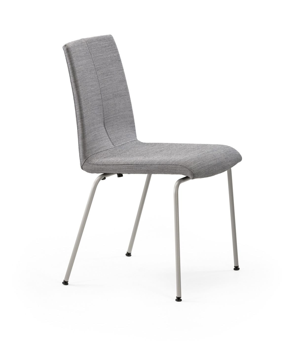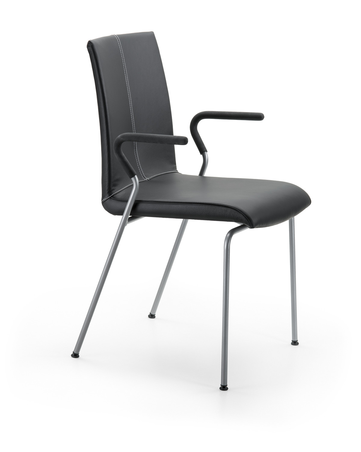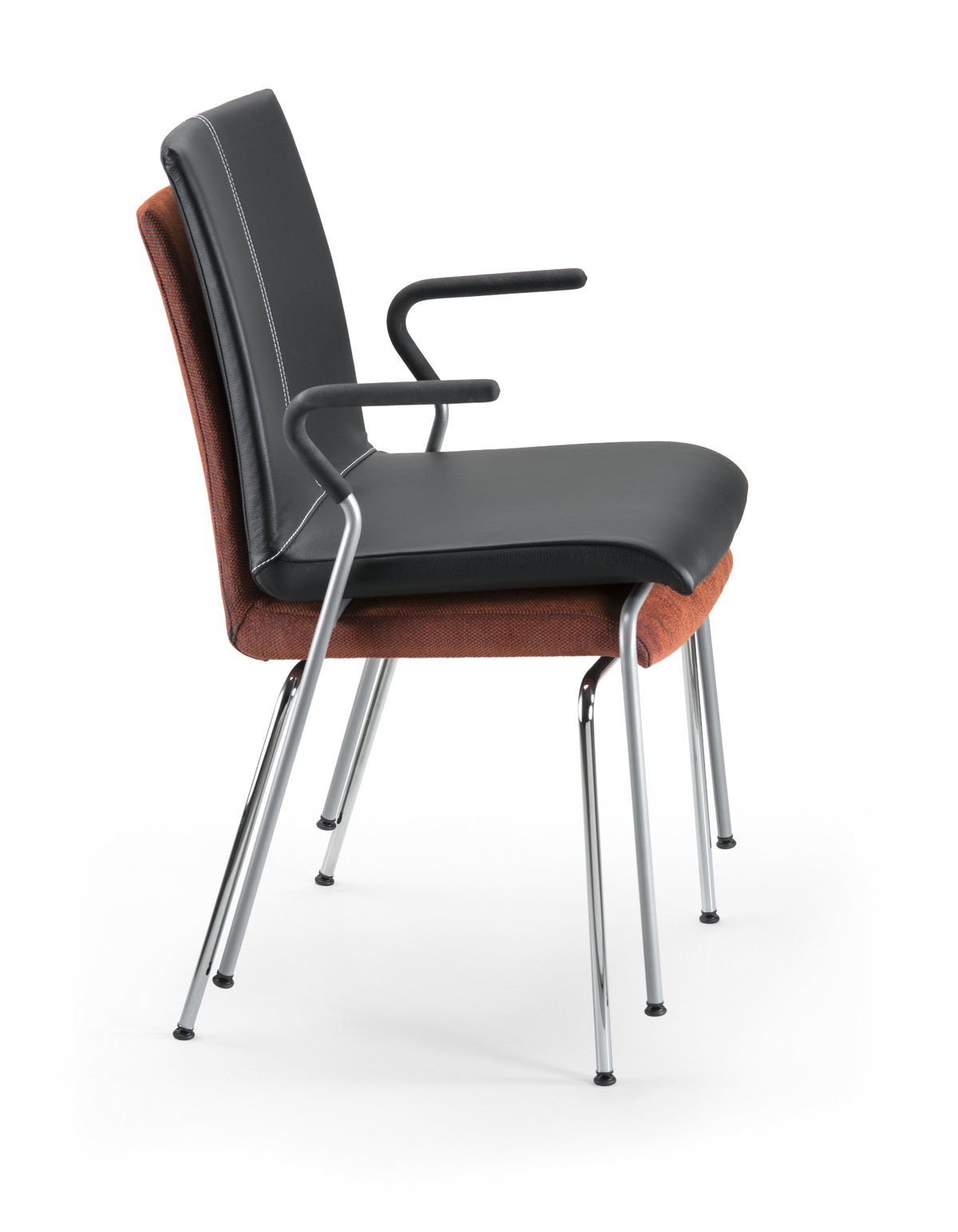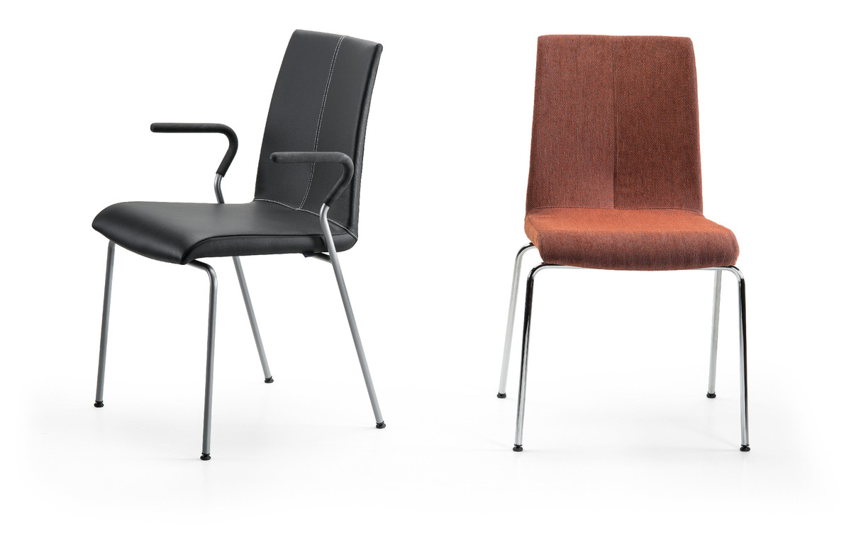 Der Lake 02 Stapelstuhl ist gepolstert. Auf Wunsch mit Armlehnen ausgestattet. Stahlgestell aus Chrom oder grauem Epoxid.