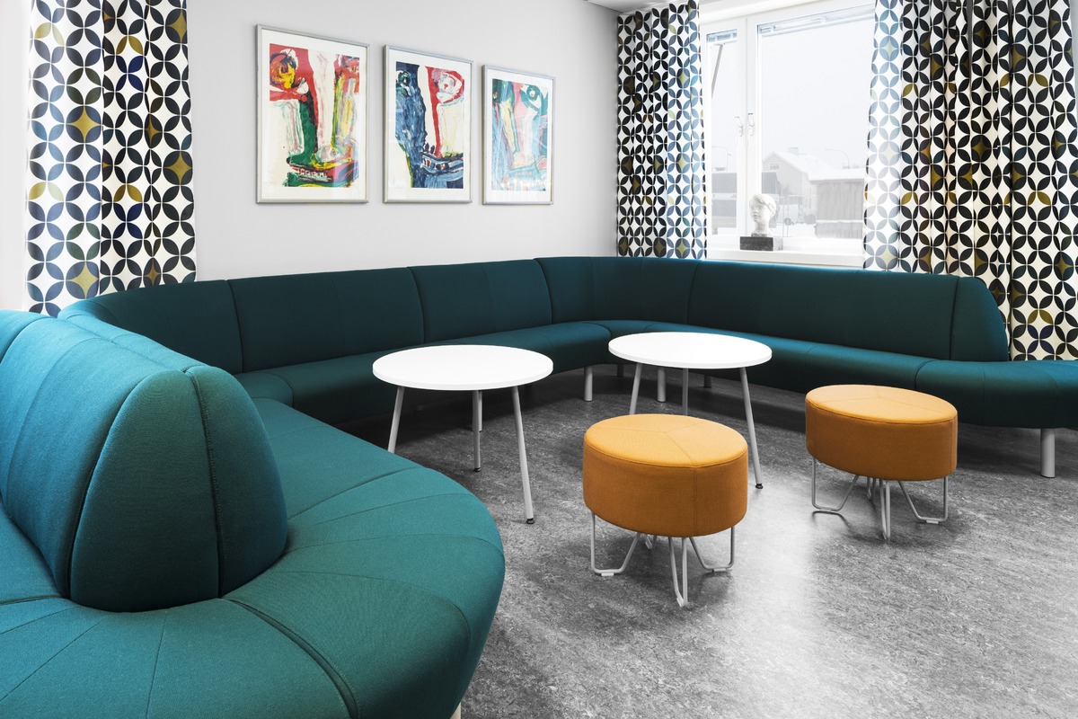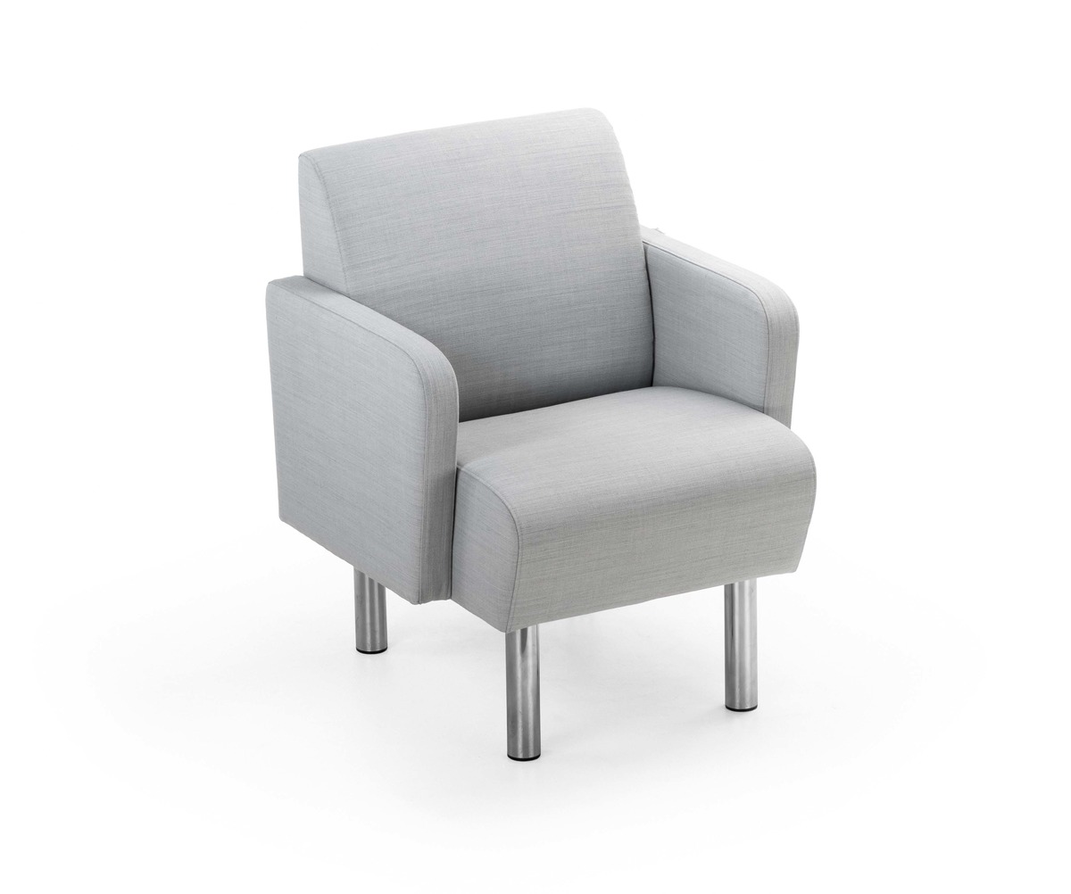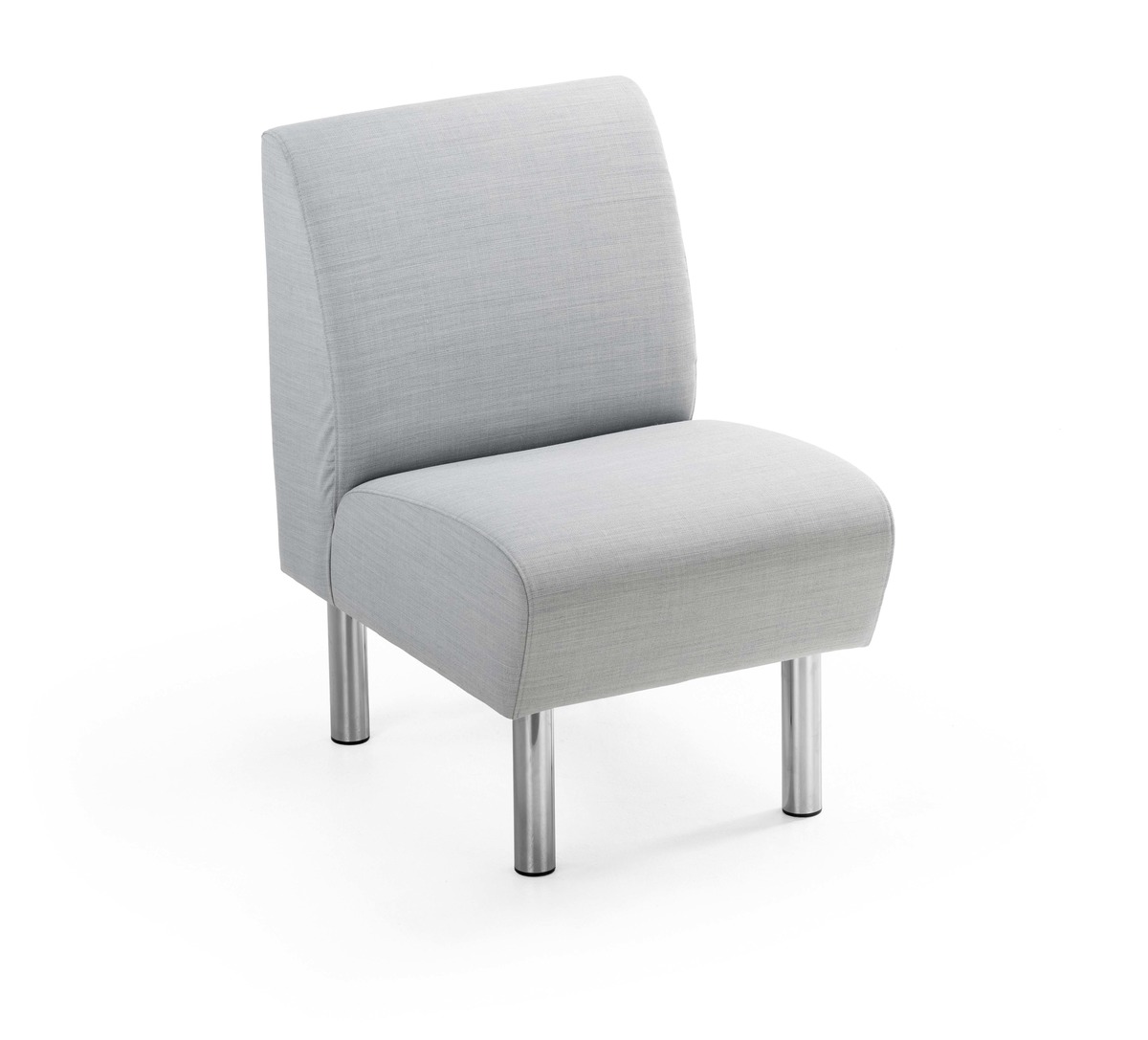 Die Modul Sitzgruppe besteht aus 52, 102 und 153 cm Modulen und 45° und 90° Einheiten für die Innen- und Außen Ecken. Beine in schwarzem oder grauem Epoxid, Chrom, Birke, Buche oder lackiert (aus Standardpalette).