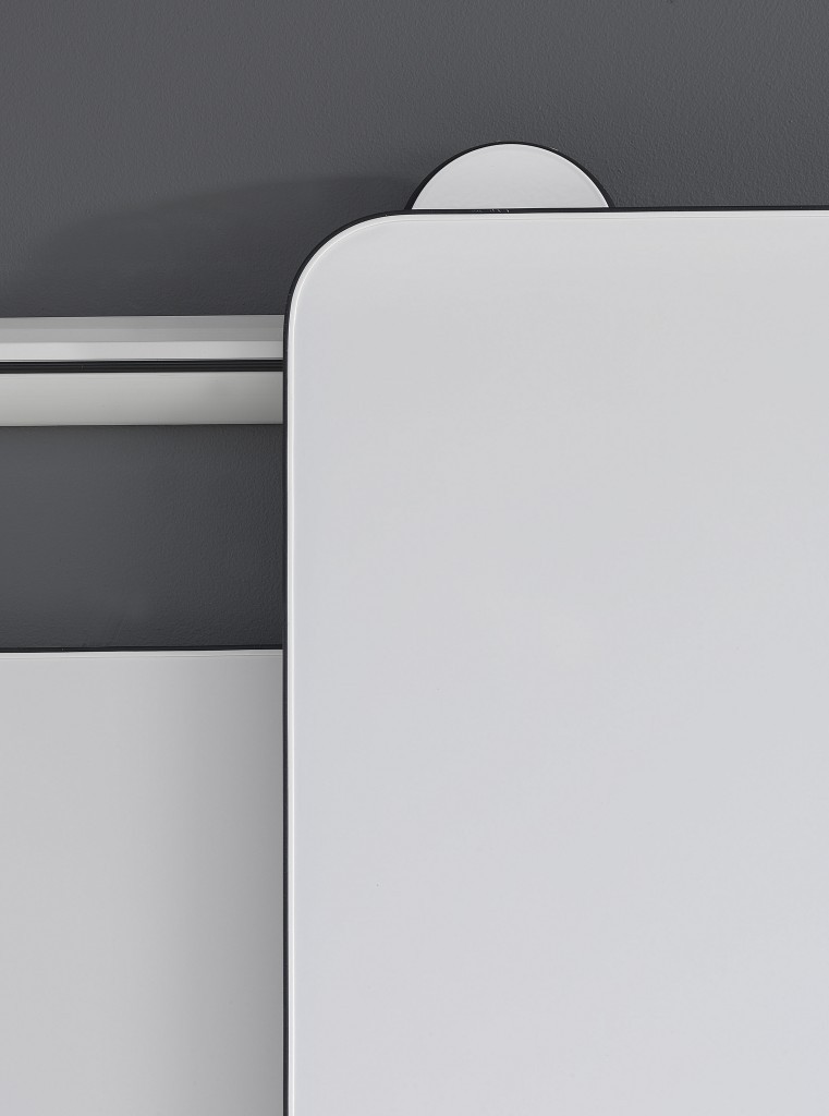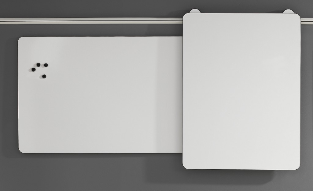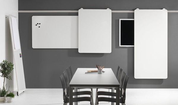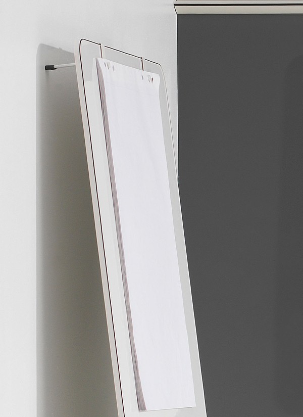 Ein innovatives Whiteboard auf Rollen, das der Anwender an ein Schienensystem hängen oder aber um 180° gedreht auch an die Wand anlehnen kann. Das intelligente und durchdachte Whiteboard-System nimmt kein Platz im Raum ein. Dennoch ist es durch seine filigranen Rundungen und einem dünnen schwarzen rundum Liner im Design auffällig zurückhaltend. Das System ist in verschiedenen Größen erhältlich und wird durch eine Flipchart Lösung abgerundet.