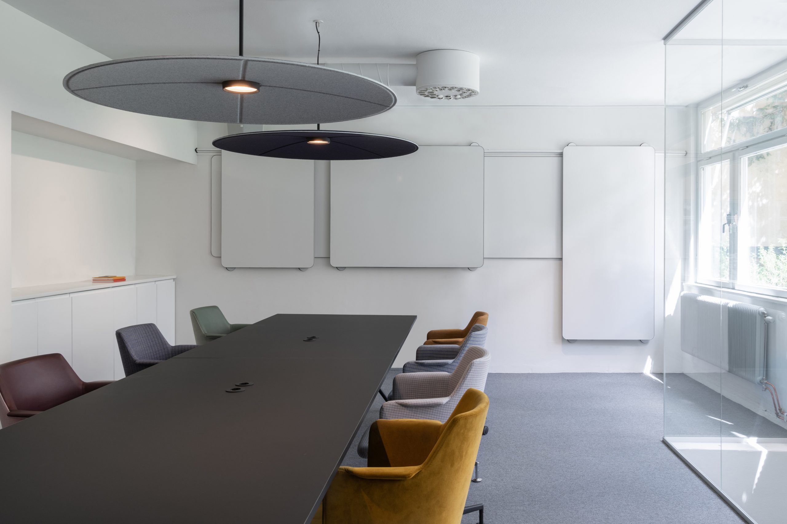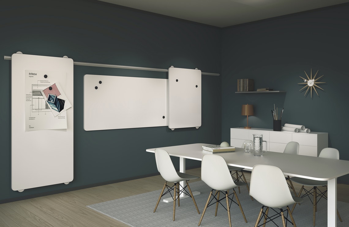 Whiteboards sind als funktionale Notwendigkeit bekannt und verleihen der Umgebung selten eine besondere Atmosphäre. Moow verkörpert das Verständnis des Designers für Ästhetik und Material: ein wirklicher Beitrag über den funktionalen Zweck eines Whiteboards hinaus.Von einer runden, leicht erhöhten, schwarzen, schmalen Linie eingerahmt, hinterlässt Moow einen exklusiven und grazilen Eindruck. Als besonders flexible Produktreihe entworfen, sind die Whiteboards dieses Systems entweder mit einer Aufhängung oder mit Rollen versehen, mit denen die Schreibtafeln frei stehen oder an die Wand montiert werden können. “Hängende Systeme sind nichts Neues, aber das Design und die Funktionalität des Moow Systems lässt andere Systeme veraltet wirken. Moow biete eine smarte und einfache Art, den Bedürfnissen eines modernen Arbeitsortes nachzukommen”, sagt Stefan Borselius.Das Moow System besteht aus wandhängenden und rollengelagerten Whiteboards in mehreren Größen, einer Wandschiene und Flipcharthaltern. Die rollengelagerten Whiteboards können gegen die Wand gelehnt oder umgedreht an die Wandschiene gehängt werden.