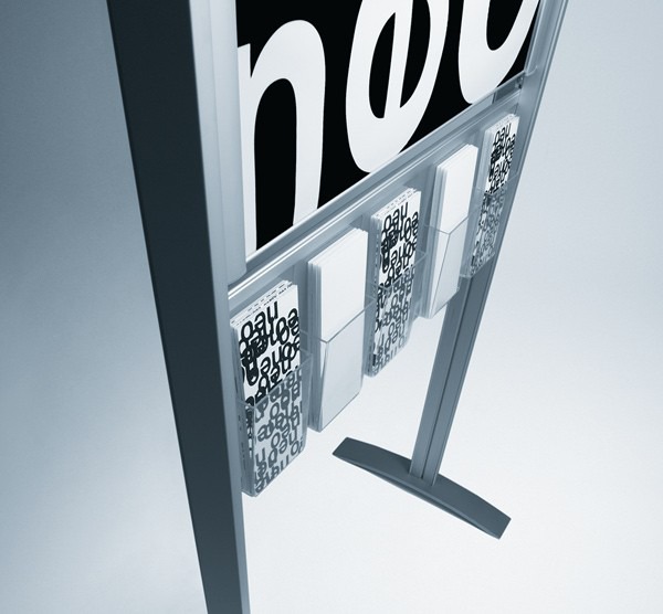 Der Neome Posterständer besteht aus eloxierten stanggepressten Aluminiumprofilen. Das Poster wird durch eine transparente Polycarbonat-Scheibe geschützt . Mit dem optional erhältlichen Set aus zwei Grundplatten mit Rollen ist er individuel einsetzbar.