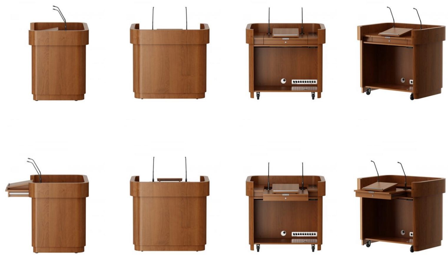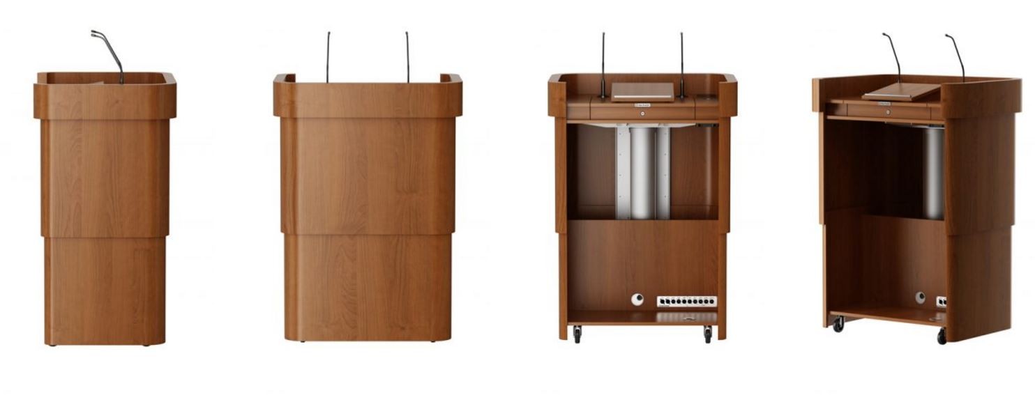 Das Palast Rednerpult wirkt durch seine runden Formen sehr elegant und stilvoll. Durch die elektrische Höhenverstellung kann die Höhe optimal an den Redner angepasst werden. Die ausfahrbare Ablagefläche bietet Rollstuhlfahrerer beinfreiheit und macht das Präsentieren angenehmer.