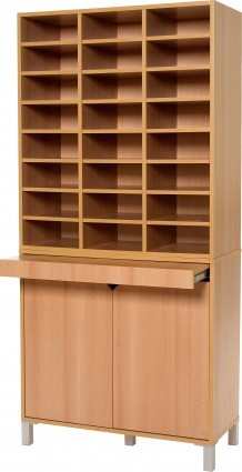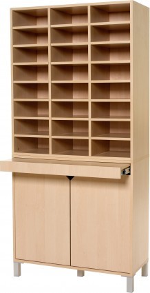 Postfachschrank. SUB-BS-10 + POST-TS-10. Unterschrank mit Ausziehplatte und versetzbaren Regalbrettern. Oberteil mit 24 Fächern (3 x 8), 110 mm hoch. Flexible Facheinteilung und zusätzliches Regalbrett. Kann mit 48 Fächern (h= 45 mm) ausgestattet werden.