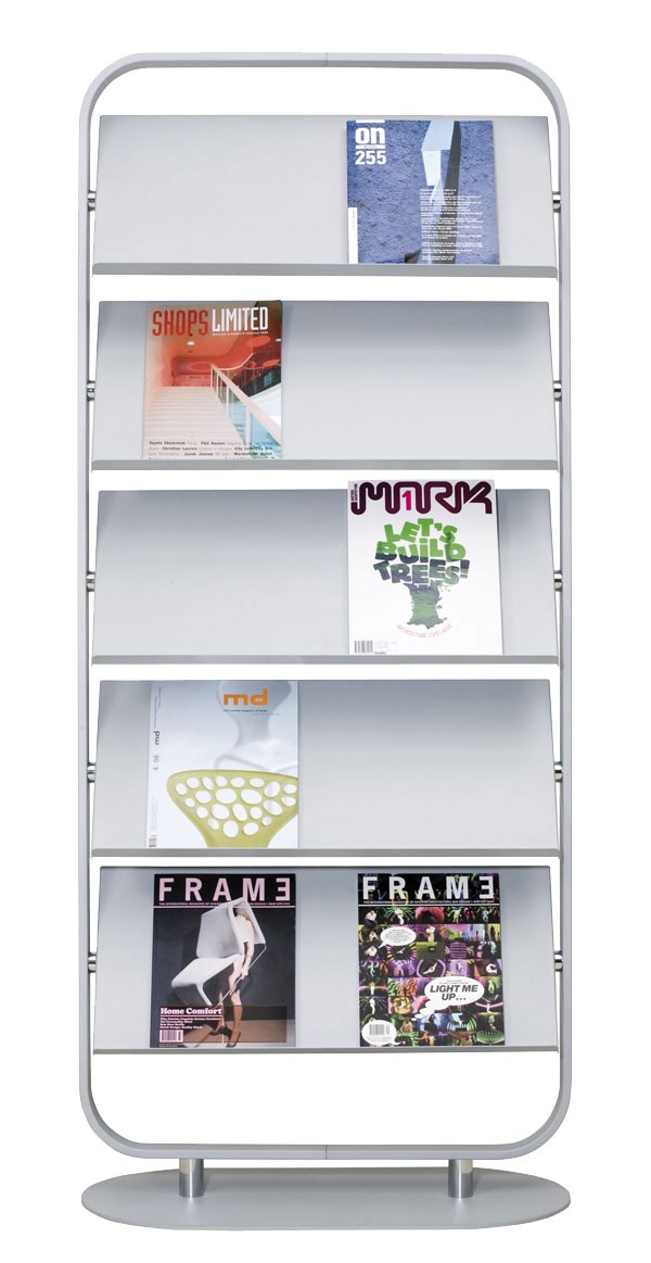 Für Ihre Werbematerialien: Ein Prospekt- und Bücherregal mit 5 multifunktionalen Tableaus. Der repräsentative Broschürenständer stammt aus der beliebten Akor-Serie. Diese Serie zeichnet sich durch ihre schönen abgerundeten Formen aus. Die Ablageflächen für die Broschüren können in jedem gewünschten Winkel eingestellt werden, also auch horizontal. Die Fußplatte aus Stahl sorgt für eine optimale Stabilität. Der Rahmen und die Fußplatte sind pulverbeschichtet und entweder in RAL9006 (Weißaluminium[Silbermetallic]) oder RAL9010(Reinweiß) überzogen. Die Verbindungen bestehen aus Glanzchrom.