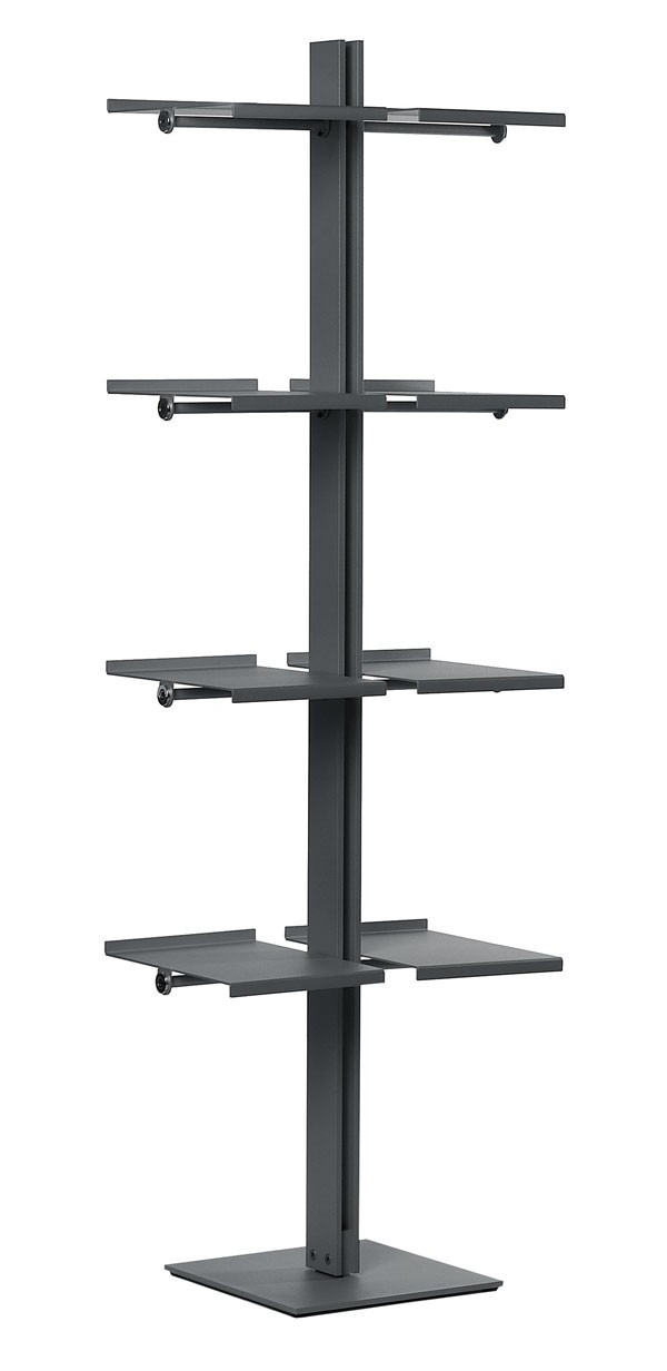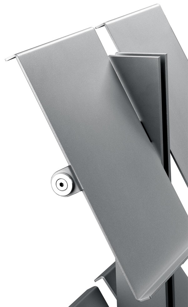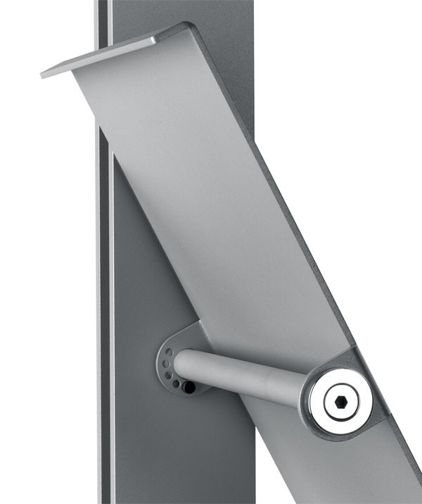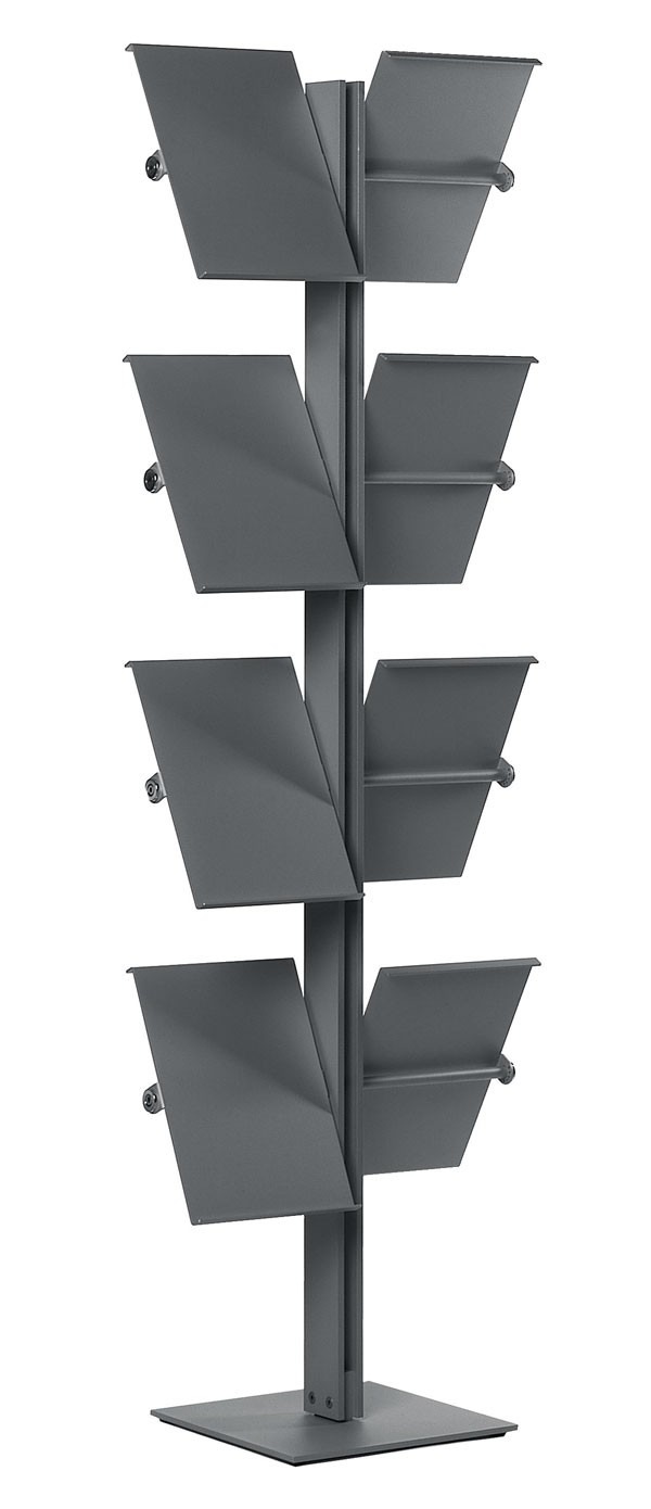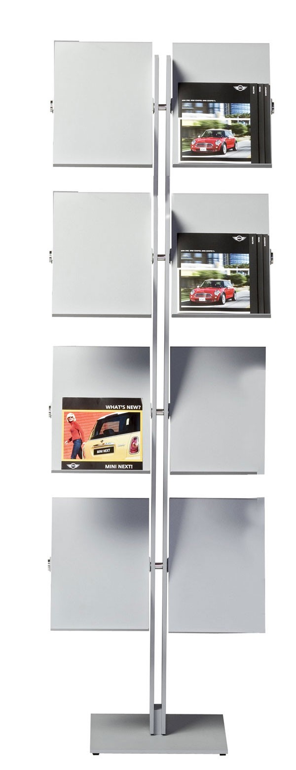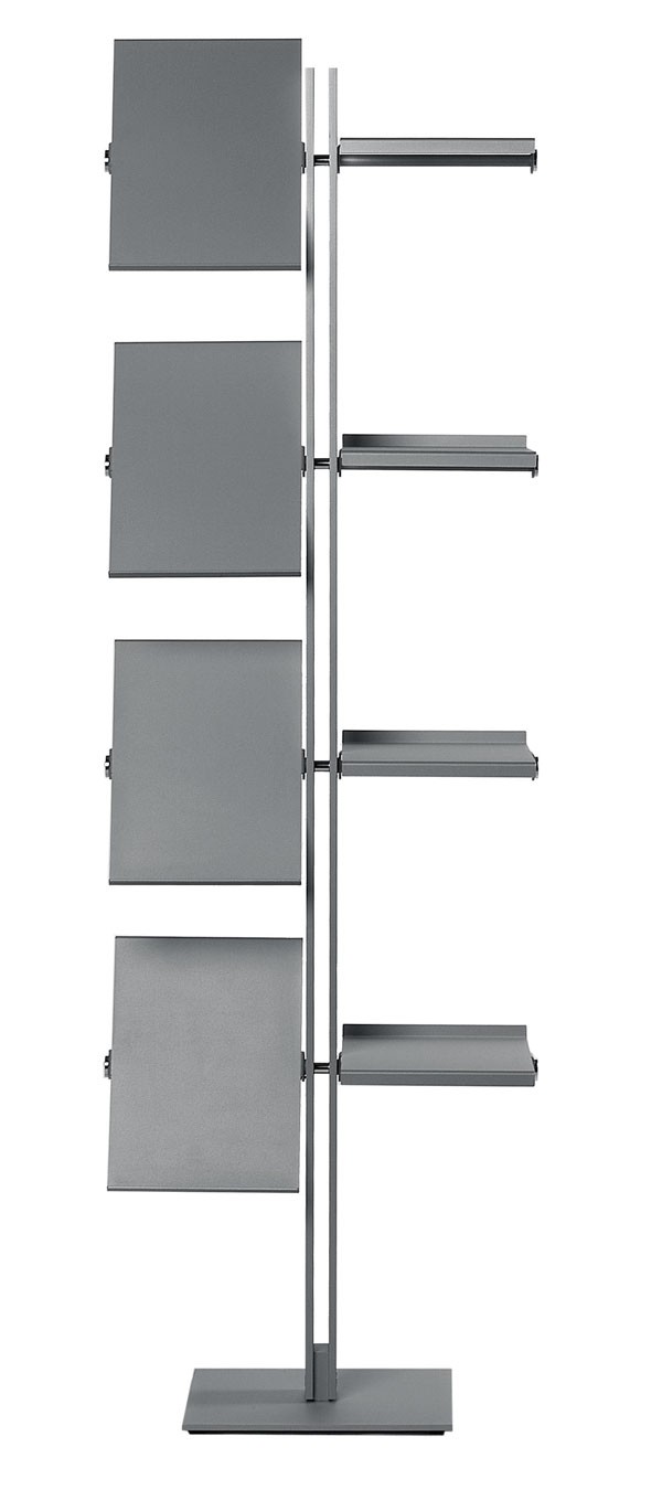 Der Prospektständer kommt mit 6-8 multifunktionalen Tableaus zu Ihnen. Eine flexible Winkeleinstellung erlaubt fünf verschiedene Tableau-Positionen. Die horizontale Position beispielsweise können Sie für Prospektvorrat nutzen. Die Tableaus und Ständer werden in Aluminium RAL 9006 gefertigt. Die Verbindungen bestehen aus poliertem Aluminium.