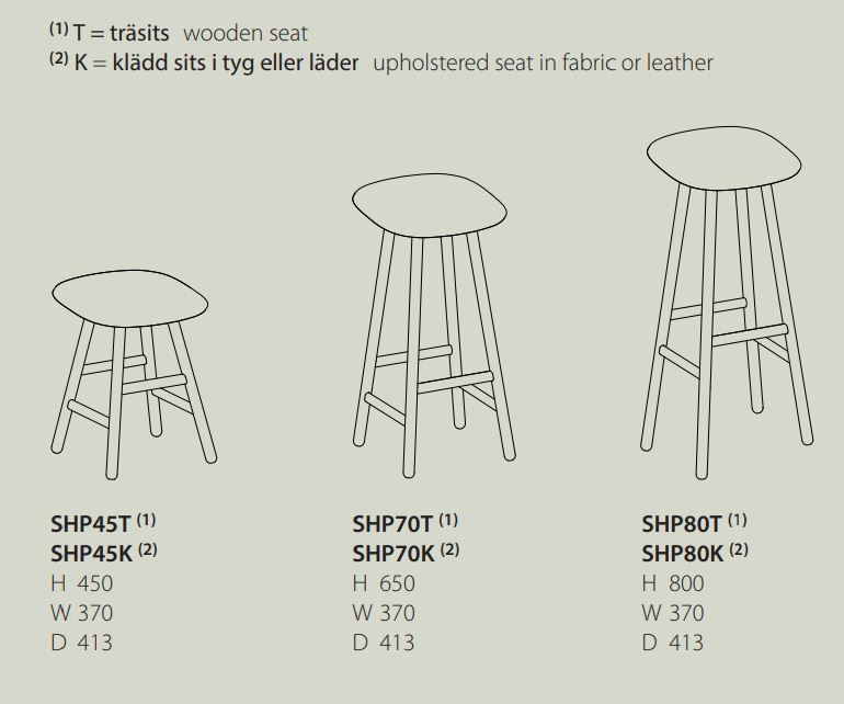 Erhältlich in massiver Eiche, Birke, Esche, Standardfarben, Standardflecken auf Esche und weiß glasierter Eiche oder Esche. Shell ist in drei Höhen von 450, 650 und 800 mm erhältlich.