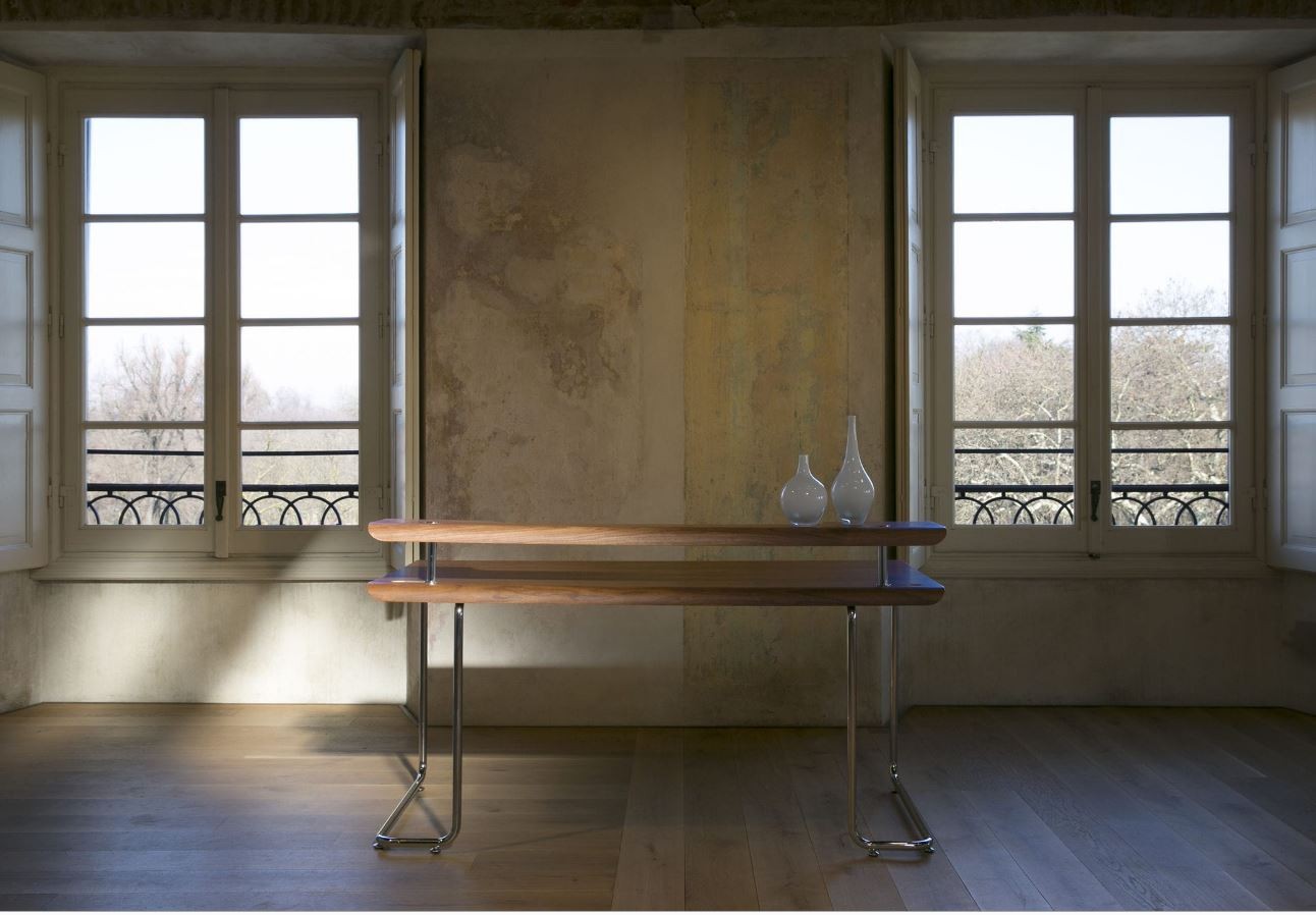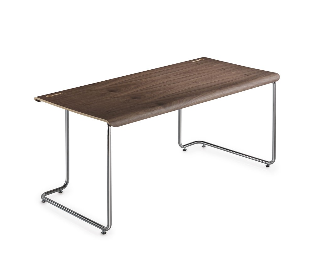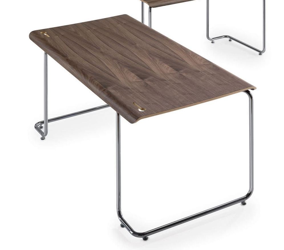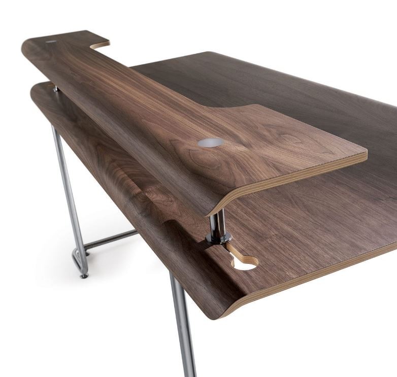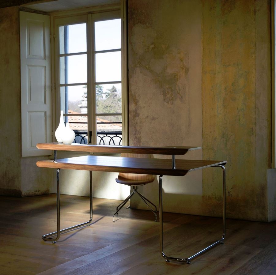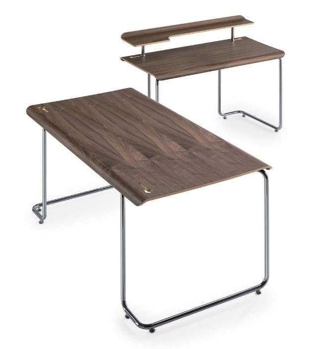Die wunderschönen Kurven dieses Schreibtisches harmoniert mit der Umgebung und fügt sich gekommt ein. Die konsistente Art dieses Schreibtisches aus Chromstahl und gebogenem Canaletto-Nussbaum fügt sich gekonnt zu einem einzigen Produkt. Das verchromte Stahlgestell wird als Strukturelement verwendet, die zur gleichen Zeit, das einzigartige Charakter dieses Schreibtisches hervorhebt. Der Schreibtsich verfügt über zwei Schlitze zur Kabelführung und zur Montage der Ablageplatte.