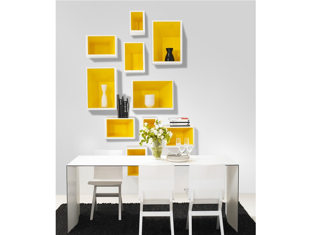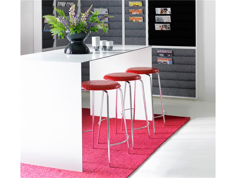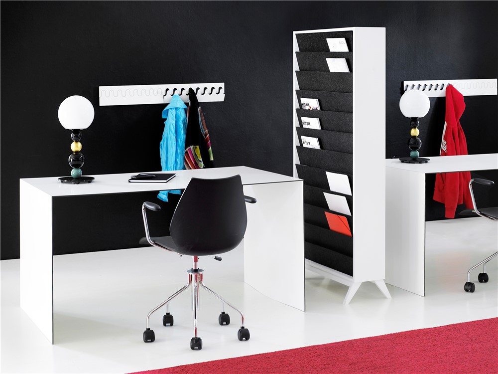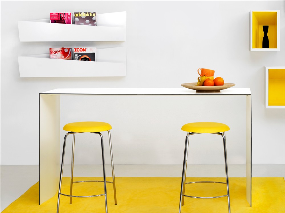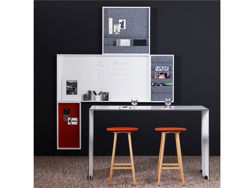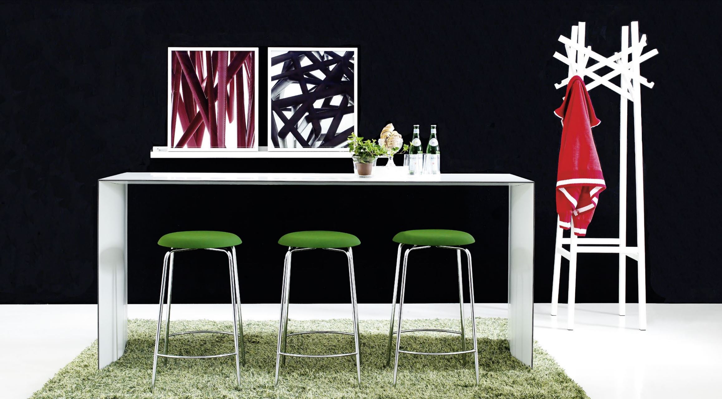 Der Tisch ist in den Höhen 400, 480, 730 und 900 mm sowie in verschiedenen Tischgrößen erhältlich. Die Tischplatte selbst ist 6 mm dick und wird in einem weißen, kompakten Laminat oder Esche schwarz gebeizt geliefert.