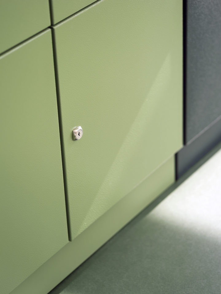 Die Locker sind mit schönen, aufliegenden Türen und einem Zylinderschloss ausgestattet. Empfehlung: bestellen Sie einen Generalschlüssel, damit Sie sich im Notfall jederzeit Zugang zu den Schänken verschaffen können. Keine Umstände mehr wegen verlorengegangener Schlüssel? Wählen Sie dann ein Sudhaus Zahlenschloss, ein Mauer Codeschloss, das VECOS Managementsystem oder jede andere Schliessmöglichkeit.